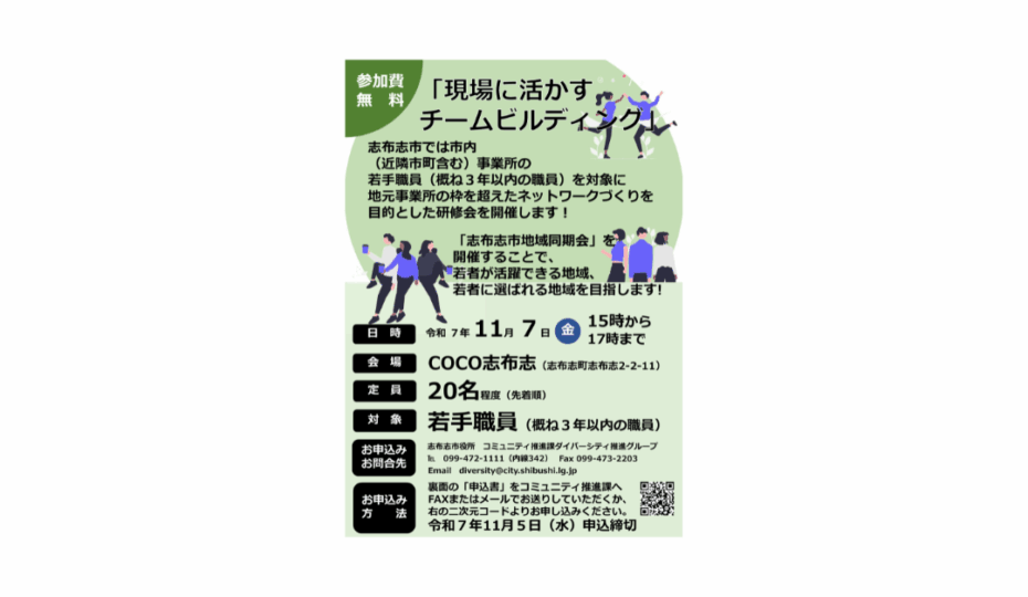 志布志市が主催する“現場に活かすチームビルディング”と題したワークショップが11/7(金)COCO志布志にて開催されます。
