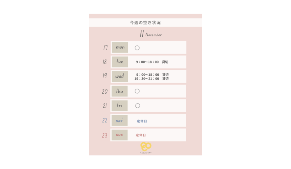 ・11/19(水) 9:00~18:00、19:30~21:00 貸切